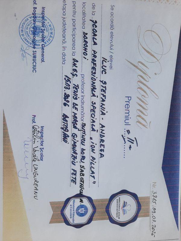 În data de 15 martie 2026, la etapa județeană a Olimpiadei Naționale a Sportului Școlar – Tenis de masă, eleva Iluc Ștefania, din clasa a V-a, la Școala Profesională Specială „Ion Pillat” Dorohoi a adus o frumoasă bucurie comunității școlare, obținând Premiul al II-lea.