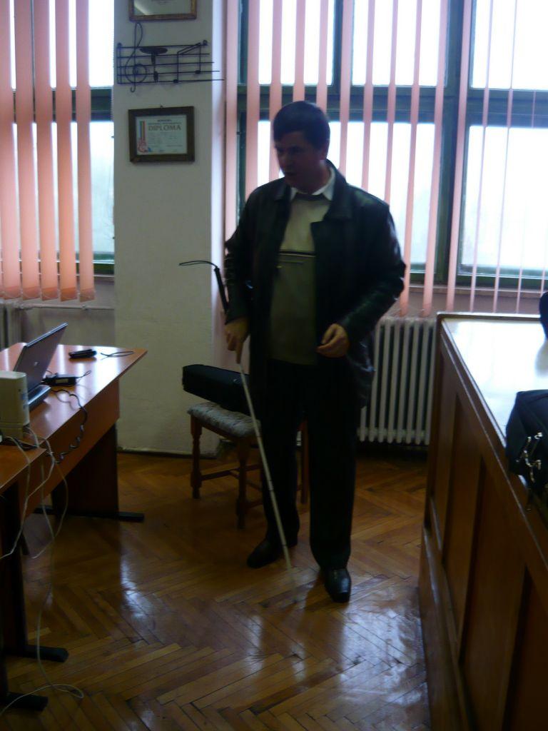 Cele mai atractive momente au fost reprezentate de câteva demonstrații ale invitatului, folosind instrumente și aparate de care se folosesc nevăzătorii în viața de zi cu zi, că : bastonul alb, picht-ul (mașina de scris în braille), jaws-ul (vocea sintetică instalată pe calculator) și șahul Braille.