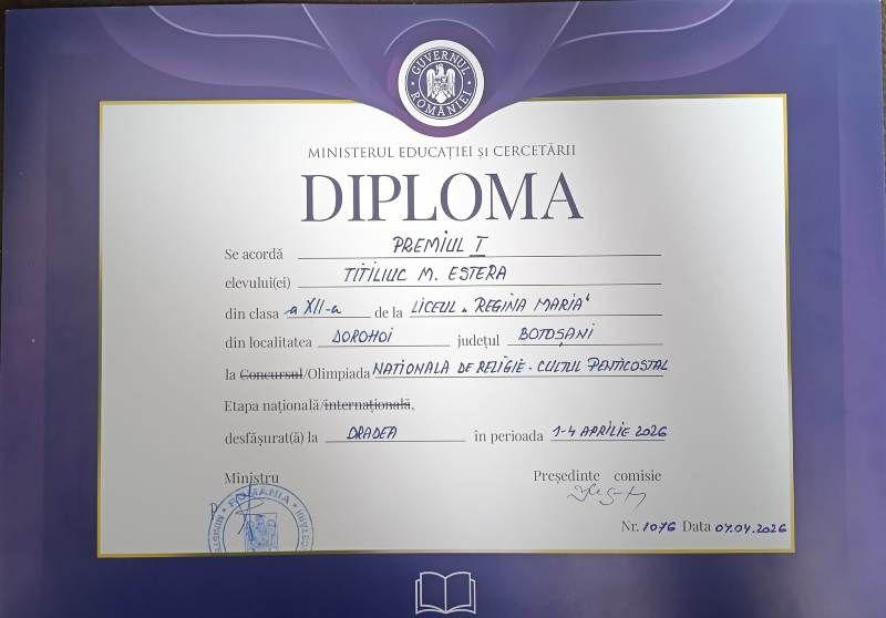 O performanță deosebită a fost obținută de Estera Titiliuc, elevă în clasa a XII-a la Liceul „Regina Maria” din Dorohoi, care a câștigat Premiul I la etapa națională a Olimpiadei de Religie – Cultul Penticostal. Rezultatul încununează trei ani consecutivi de participare la această competiție, timp în care eleva a reușit de fiecare dată să se califice în etapa finală.