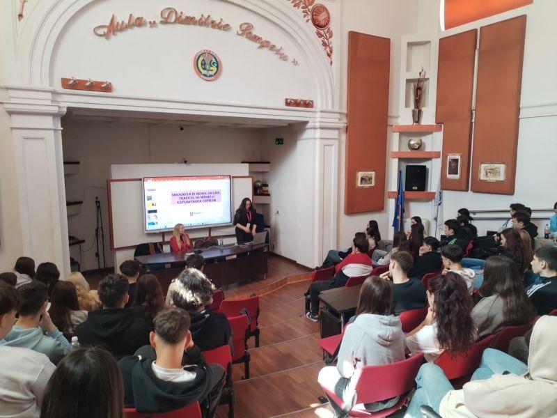 Voicu Corina, fost judecător la Curtea de Apel Pitești, fost formator INM, expert în drept penal și egalitate de gen, vicepreședinte și co-fondator ADEPT, Asociația Dreptate și Educație Pentru Toți, le-a vorbit elevilor despre diversele forme de violență la care pot fi supuși copiii și cum pot fi ajutați aceștia de către ceilalți actori sociali. Traficul și exploatarea copiilor, siguranța în mediul online, cât de vulnerabili sunt copiii și adolescenții români pe platformele sociale, cum poate fi școala un suport pentru victime sau martori la violență au fost, de asemenea, teme abordate în discuția cu elevii colegiului.