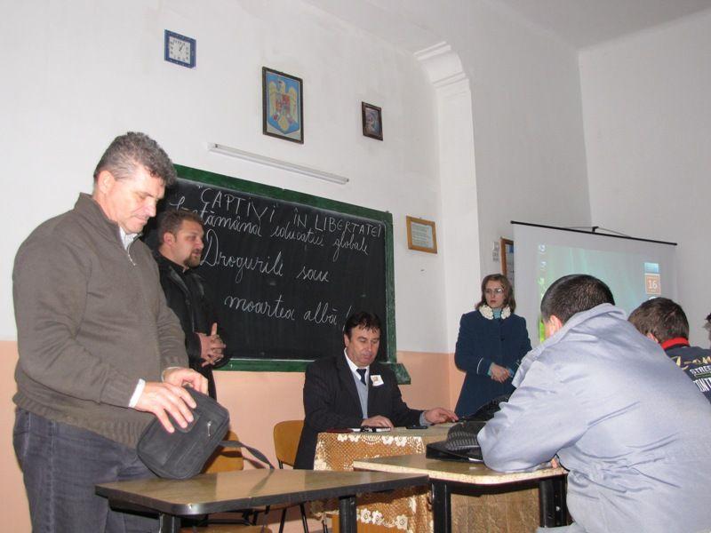 Au luat atitudine împotriva consumului de droguri profesorii: Vremescu Petru şi Irimia Corina-Elena. La această activitate au fost invitaţi preotul Barabasa Iulian şi psihologul Domonco Ioan. După ce au vizionat filmul Etnobotanicele şi implicaţiile lui, a urmat o dezbatere pornind de la afirmaţia: Drogurile distrug identitatea individului şi relaţia cu semenii (pr. Barabasa Iulian). Scriitorul francez Denis Diderot spunea:,,Un om este fericit când face cât mai mulţi oameni din jurul lui fericiţi.’’ Însă, un elev care consumă droguri face foarte mulţi oameni nefericiţi, mai ales părinţii! (Domonco Ioan).