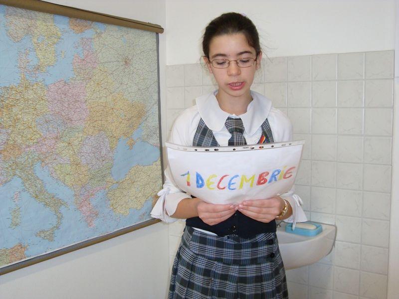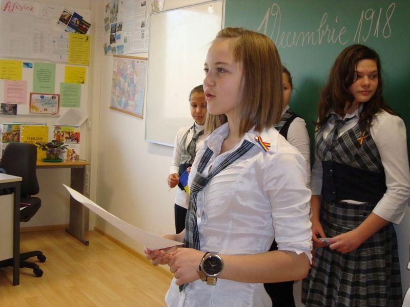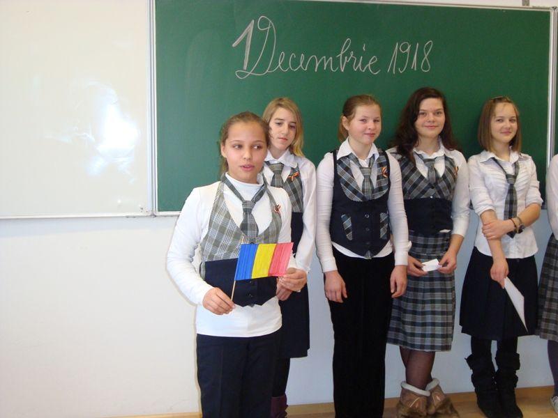Activitatea s-a numit: „Picaturi de iubire de ziua ta, tara mea!”, scolarii realizand si o sceneta cu acelasi titlu. In cadrul activitatii, a avut loc o dezbatere despre semnificatia zilei de 1 Decembrie 1918, accentuand faptul ca aceasta zi este cea mai importanta realizare a poporului roman. In holul institutiei de invatamant a fost expus un panou informativ cu referire la importanta acestei zile, la realizarea caruia copiii au contribuit cu placere.