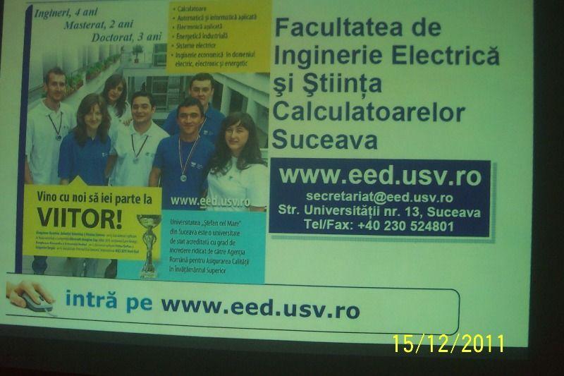Prezentările legate de numărul de locuri de şcolarizare disponibile, condiţiile de cazare, condiţiile sociale, laboratoare şi sălile de cursuri au fost susţinute de Marius Prelipceanu, asistent universitar în cadrul Departamentului de Calculatoare, Electronică şi Automatică al FIESC Suceava. În două cele două zile cât a durat prezentările FIESC la Grupul Şcolar Vlahuţă Şendriceni, Grupul Şcolar Regina Maria Dorohoi şi Colegiul Ghica Dorohoi peste 500 de elevi din anii terminali au aflat, unii pentru prima dată de faptul că universitatea din Suceava face parte din universităţile de stat de top din România şi oferă viitorilor studenţi prin planurile de şcolarizare şi programele aprobate posibilitatea de a aprofunda cunoştinţele în domeniul calculatoarelor, informaţicii, automatizărilor, ingineriei electrotehnice şi electrice.