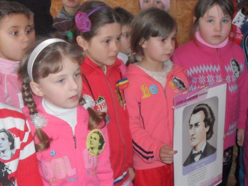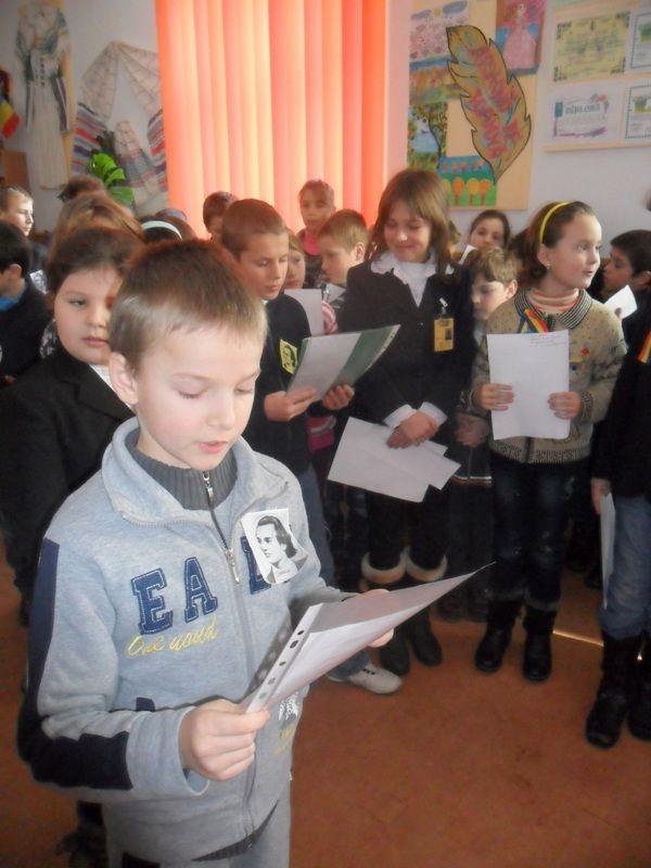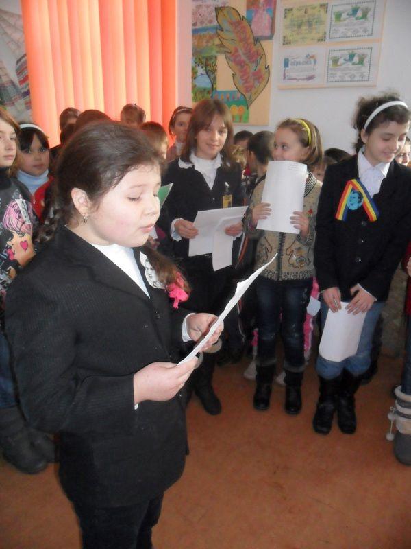 Elevii claselor I- IV, de la Şcoala ,,MIHAIL SADOVEANU,, din Dumbrăviţa, au marcat aceste evenimente într-un mod cu totul deosebit, participând cu emoţie la o oră de istorie bogată ca un poem. Totul a început în biblioteca şcolii, unde doamna învăţătoare Dodu Angela a deschis paginile eminesciene pentru micii cititori. Aceştia au descoperit în versuri unice scene de istorie şi le-au citit cu mândrie. De la boboceii de clasa I şi până la şcolarii de clasa a IV a, toţi au ascultat poezii nepreţuite din opera lui Mihai Eminescu, citite de unii colegi.