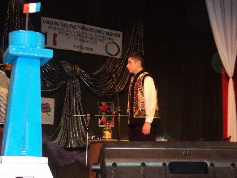 „Ediţia a-V-a 2012 a «Sãptãmânii limbii franceze şi a francofoniei» (17-25 martie 2012) de la Colegiul Naţional „Grigore Ghica” Dorohoi, se desfãşoarã sub sloganul «Le français est une chance» («Franceza este o şansã»), într-adevãr este o şansã oferitã mai ales tinerilor pentru a intra în contact cu lumea dincolo de frontiere şi oceane, iar aceastã şansã trebuie s-o oferim tuturor celor care, din ce in ce mai numeroşi, aleg sã înveţe limba francezã pentru a se deschide lumii. Prin acest spectacol, celebrãm diversitatea acestei frumoase limbi, limba francezã, unealta prin excelenţã a legãturii sociale, a exprimãrii personale, dar şi cheia de acces la culturã şi cunoaştere” a spus coordonatoarea activitãţii prof. Iulia-Maria Stoica. (DorohoiNews.ro)