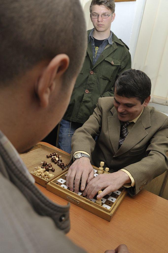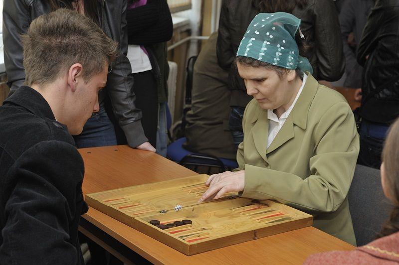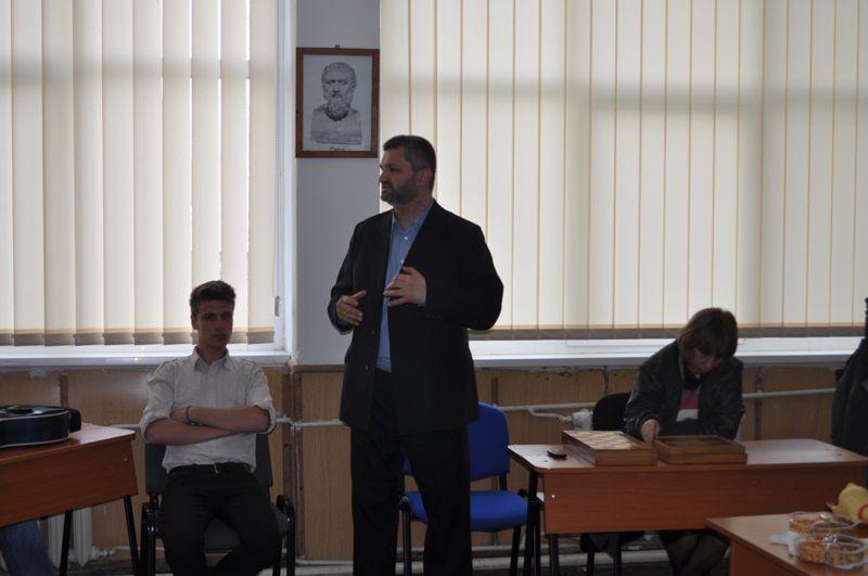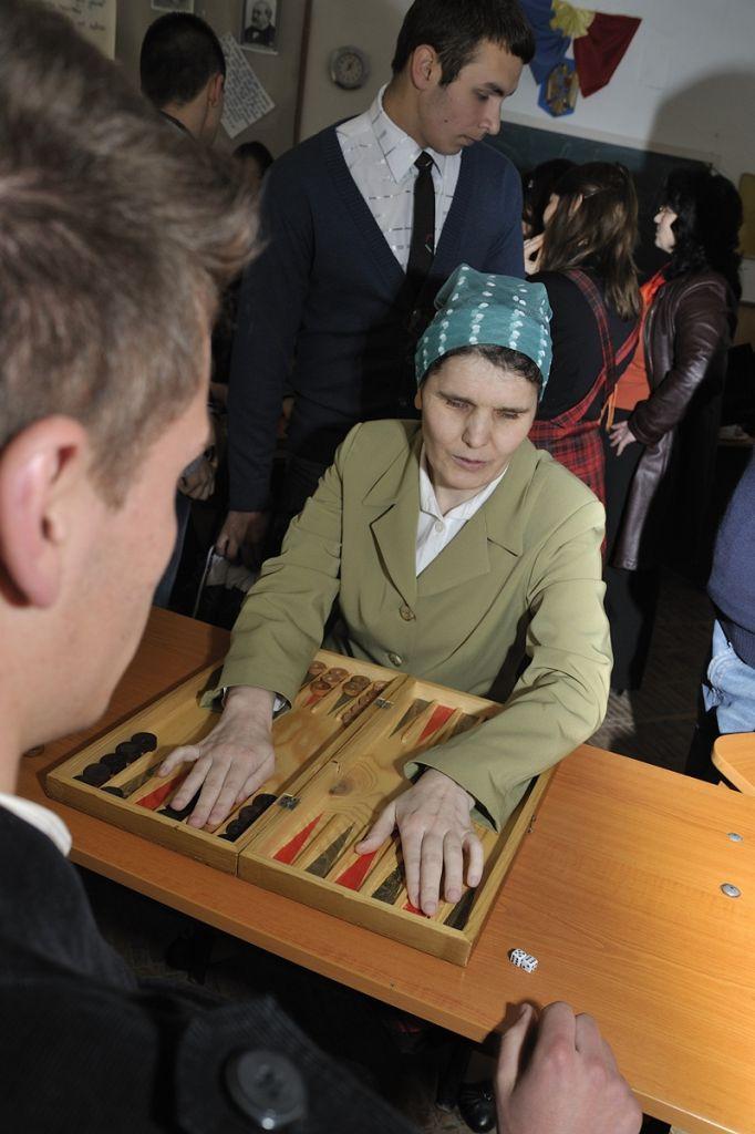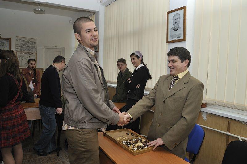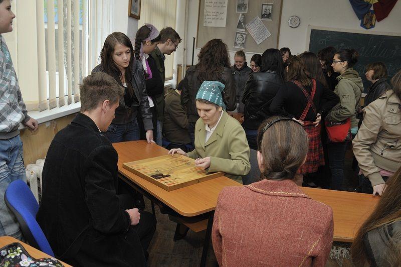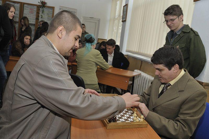 Apoi au fost prezentate in PowerPoint cateva imagini din activitati organizate de Filiala, material realizat de prof. Sergiu Mihoc si comentat de d-na Carmen Moraru. Au urmat cateva demonstratii. Astfel, d-na Paraschiva Seliman a citit in limbajul Braille un fragment din cartea amintita mai sus. Aceeasi invitata a jucat table Braille cu elevul Eduard Bostan (XI C), iar Sandu Surugiu a jucat sah Braille cu elevul Marius Patrascanu (XI C).