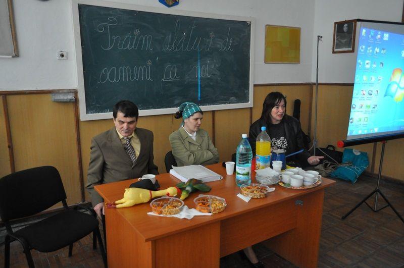 Prima secventa a activitatii a fost dezbaterea pe marginea cartii autobiografice “Omul cu ochelari negri”, de Ion Blajan, cea mai activa fiind eleva Adelina Borta (XI C). Elevii au purtat o discutie foarte interesanta si utila cu invitatii, despre aspecte din viata cotidiana a nevazatorilor.
