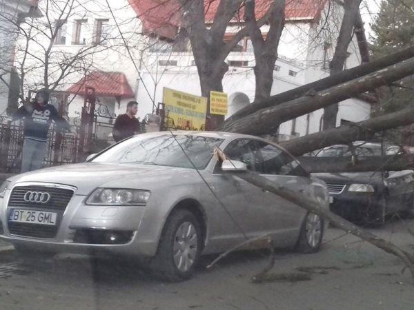 Autoturismul marca Audi era parcat pe o strada din municipiul Iasi, incidentul avand loc in urma unei furtuni puternice care a navalit peste oras, acum doua zile.