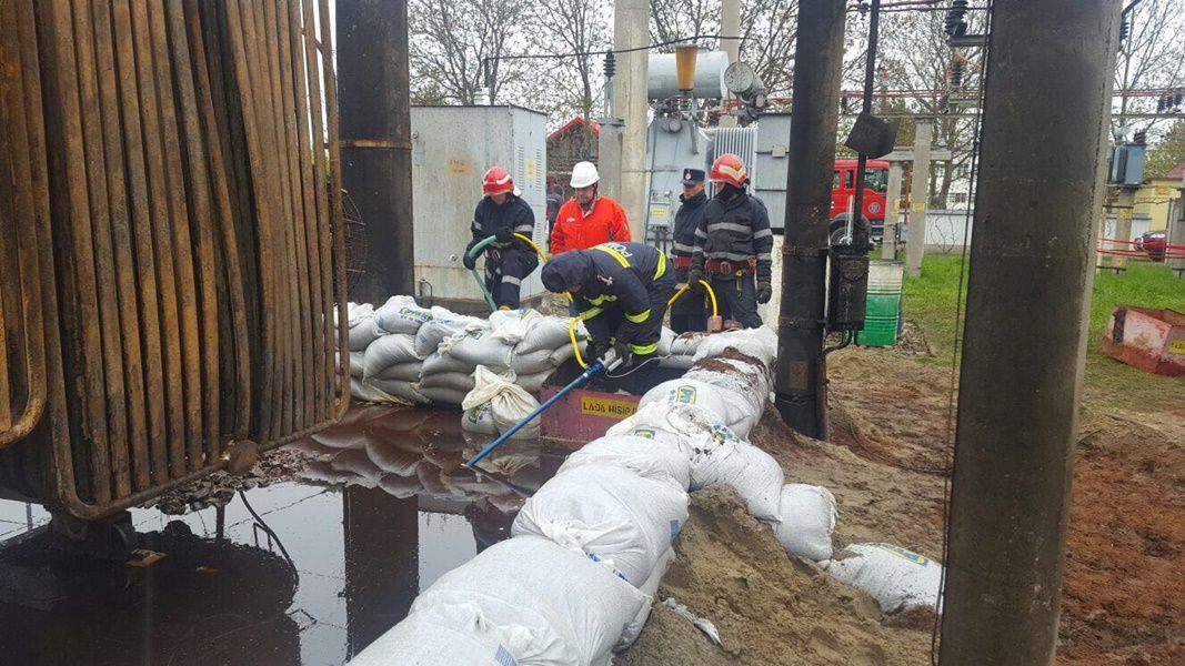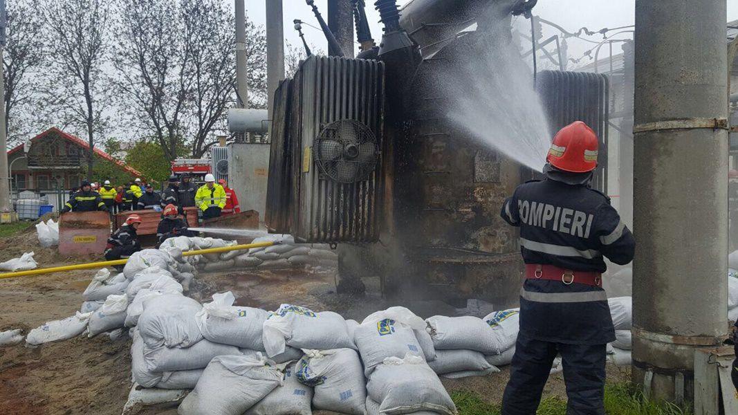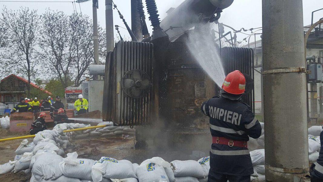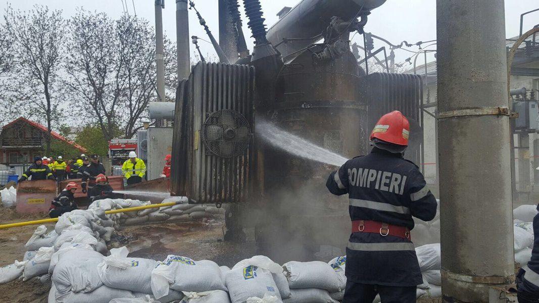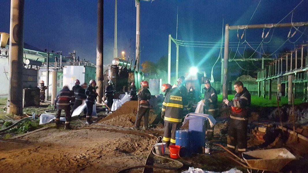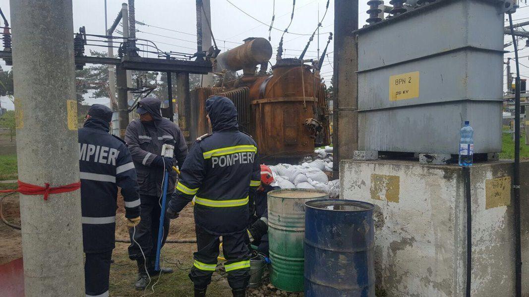Pompierii continua sa incarce in recipiente substanta rezultata langa transformator, care ulterior va fi neutralizata de catre o firma din judetul Brasov.