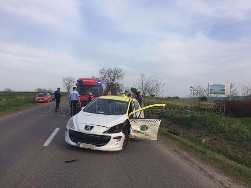 Un grav accident de circulaţie a avut loc, vineri după amiază, pe drumul Botoşani-Dorohoi. Evenimentul rutier s-a petrecut în zona iazului Loeşti când un autoturism Peugeot inscripţionat taxi a vrut să facă stânga pentru a intra la iaz, însă în timpul manevrei era depăşit de un autoturism Citroen.