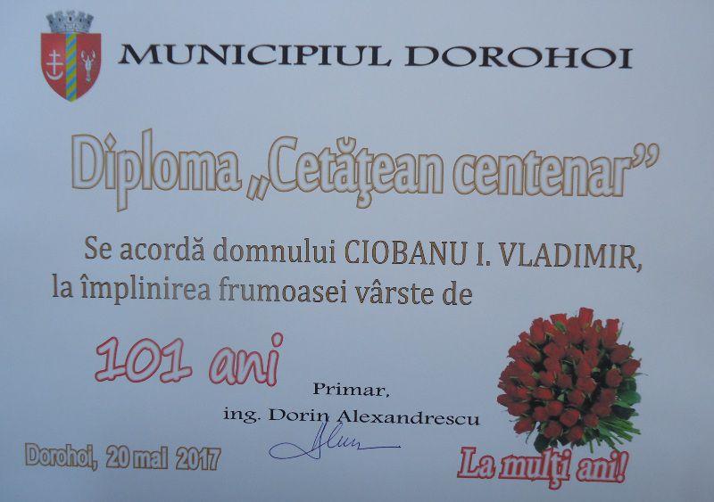 Astăzi 20 mai 2017, domnul Ciobanu I. Vladimir, veteran de război, împlinește frumoasa vârstă de 101 ani, cu aceasta ocazie Primarul municipiului Dorohoi, îi dorește un sincer LA MULTI ANI .