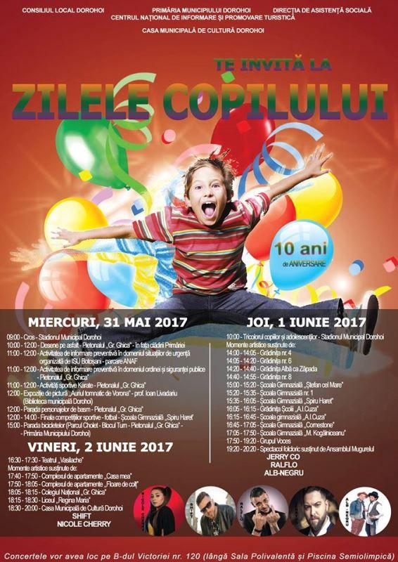 Începând de miercuri, 31 mai şi până joi, 2 iunie 2017, copiii din Dorohoi se vor bucura de o multitudine de evenimente organizate în cinstea lor.