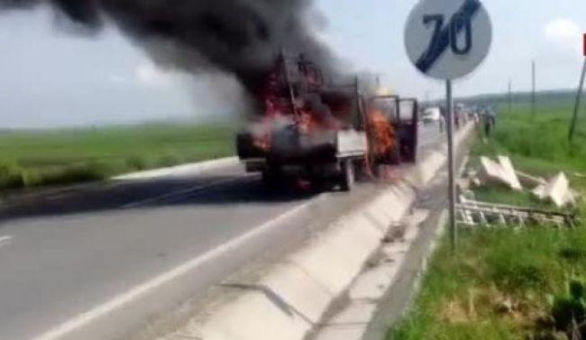 Pompierii cred ca valvataia a pornit de la ambalajul incarcaturii, care s-a aprins dupa ce geamurile transportate s-au comportat ca o lupa si au amplificat radiiatiile solare. Sursa: ProTv.ro