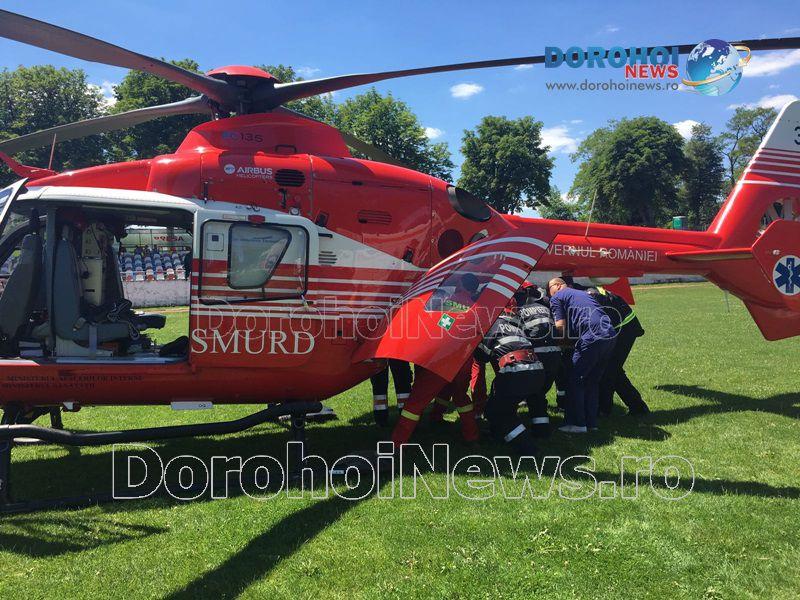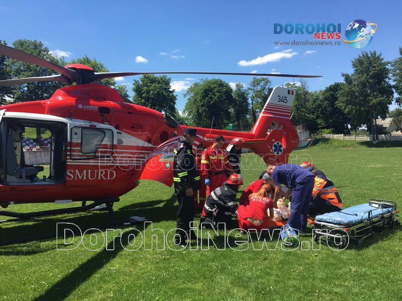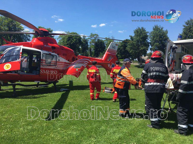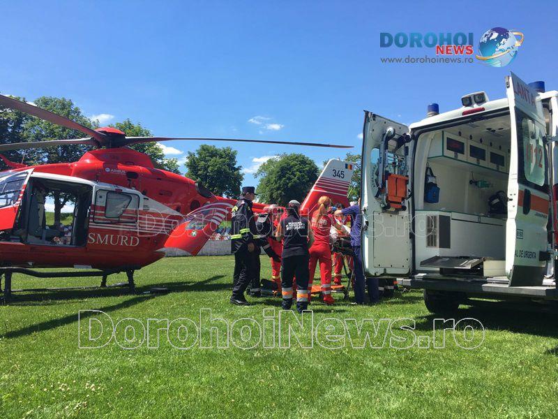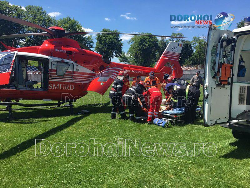 Ana M., din Comănești, comuna Suharău, a fost adusă de ambulanță la Spitalul Municipal Dorohoi, după ce, aceasta a început să nu se simtă bine din cursul dimineții. Acesta a primit primele îngrijiri medicale şi a fost solicitat ajutorul elicopterului SMURD.