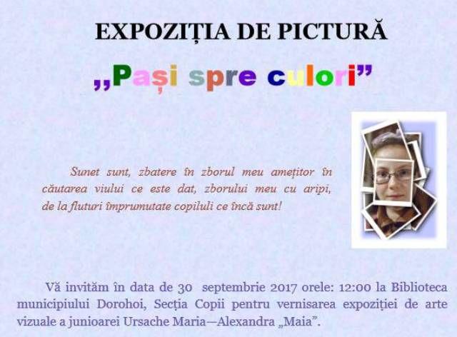 Sâmbătă 30 septembrie 2017, ora 12:00 la Biblioteca Municipală Dorohoi va avea loc vernisarea expoziției de arte vizuale a junioarei Ursache Maria—Alexandra „Maia”.