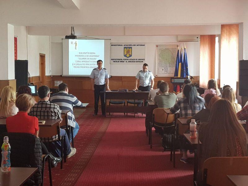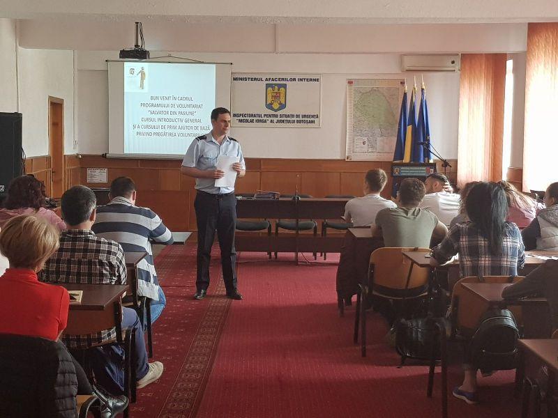 Astfel, în perioada 24 aprilie – 04 mai a.c., la sediul I.S.U. Botoşani se desfăşură cursurile introductive privind structura, misiunile şi atribuţiile Inspectoratului pentru Situaţii de Urgenţă Botoşani și cursurile de prim ajutor de bază.