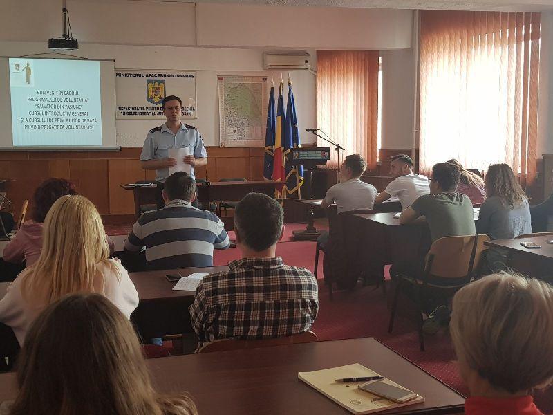 Voluntarii vor parcurge noţiunile de prim ajutor de bază susţinute, cu profesionalism, de către formatorii din cadrul inspectoratului în aşa fel încât, la finalul cursurilor să fie în măsură să utilizeze tehnicile de bază în acordarea primului ajutor calificat pentru a fi angrenaţi în diverse acţiuni de intervenţie, ajutor umanitar şi popularizare a mesajului preventiv.