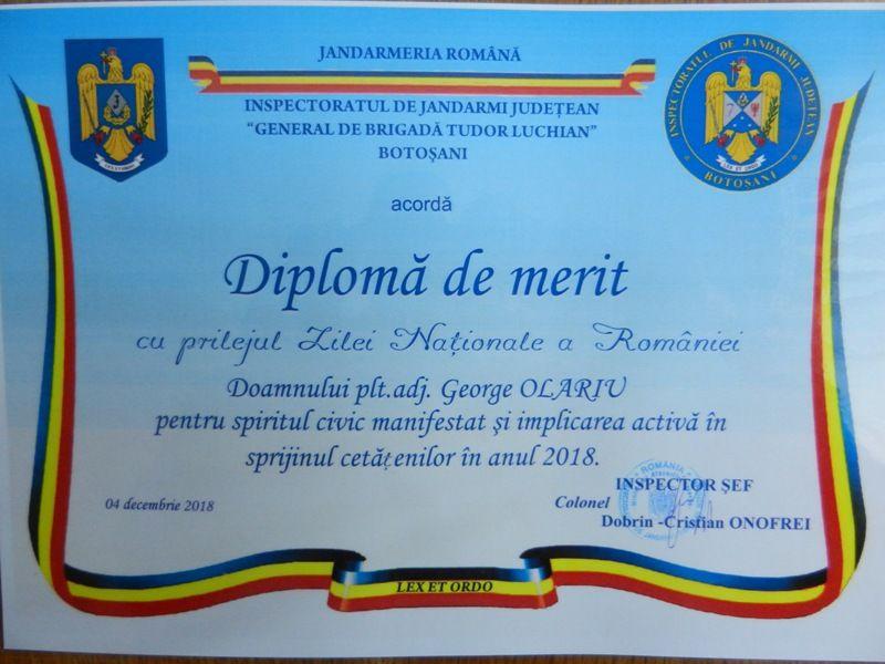 Plutonierul adjutant Olariu George a primit de la conducerea inspectoratului o diplomă de merit pentru modul în care a acţionat în data de 25 iulie a.c., în timp ce executa o misiune de menţinere a ordinii şi liniştii publice în sistem integrat, împreună cu un agent de poliţie, dar şi pentru rezultatele bune obţinute în activitate în cursul acestui an.