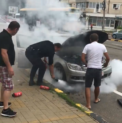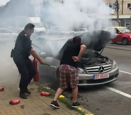 În ziua respectivă, subofiţerul a intervenit pentru stingerea incendiului izbucnit în jurul orelor 12.00 la un autovehicul care circula pe strada Calea Naţională din municipiul Botoşani. Până la sosirea pompierilor, jandarmul a împrumutat un extinctor de la vatmanul unui tramvai şi l-a folosit pentru a împiedica propagarea focului, în timp ce agentul de poliţie a acţionat pentru limitarea accesului curioşilor şi fluidizarea circulaţiei în zonă.
