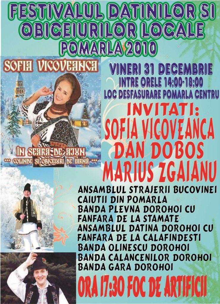 Vineri , 31 decembrie 2010, intre orele 14:00-19:00, traditiile si obiceiurile locale de Anul Nou vor capata respectul cuvenit prin amploarea evenimentului organizat de Primaria Pomarla in centrul civic al comunei unde sunt asteptate numeroase grupuri de uratori, benzi si rapsozi ai cantecului popular. Invitatul special si atractia zilei, este Sofia Vicoveanca, care va sustine incepand cu ora 15:00, un frumos spectacol.