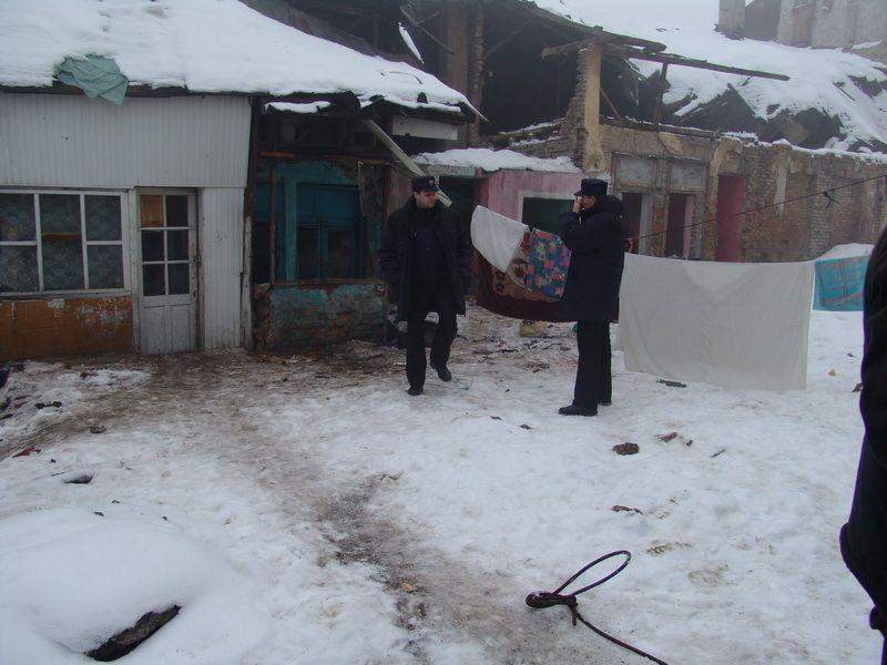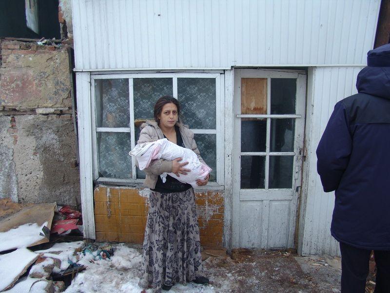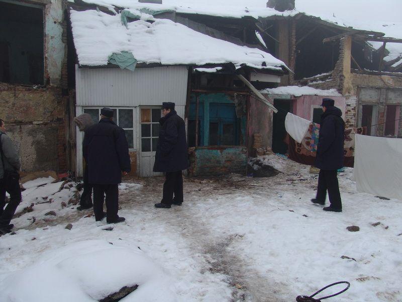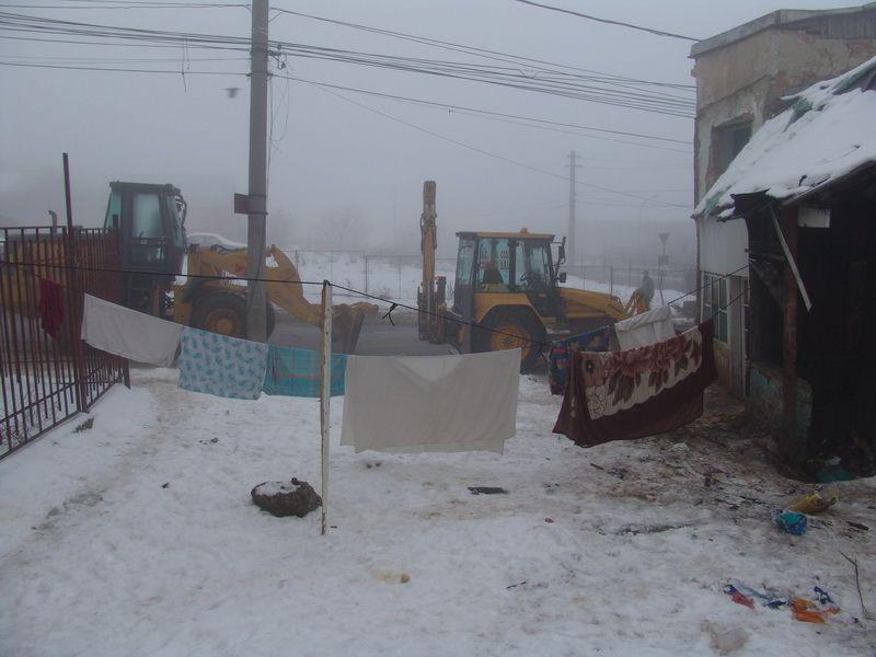 Angajatii societatii de Servicii Publice Locale au inceput lucrarile de demolare a cladirilor vechi din zona centrala a orasului luni, 10 ianuarie, cu o intarziere de peste o ora intrucat au constatat cu uimire faptul ca in acele ruine isi gasisera adapost o familie de romi care aveau si un copil.