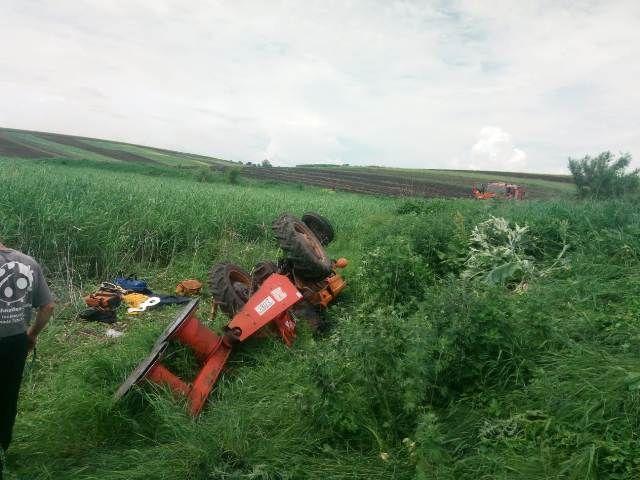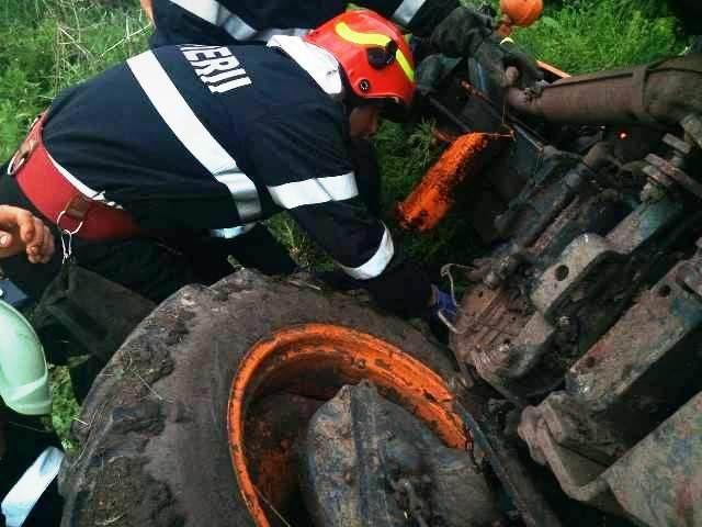 Bărbatul a rămas captiv între utilaj și sol, cu piciorul prins sub aripa tractorului. Pompierii au ridicat utilajul cu accesorii specifice, i-au acordat primul ajutor și l-au transportat la ambulanță.