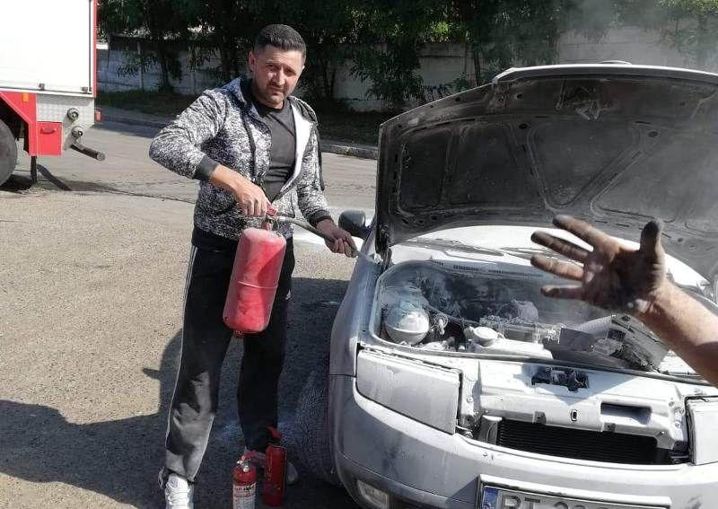 Pompierul, a oprit, a luat stingatorul din autoturismul proprietate și a intervenit. Pentru a lichida incendiul a mai folosit un stingător de la un service auto din zonă.