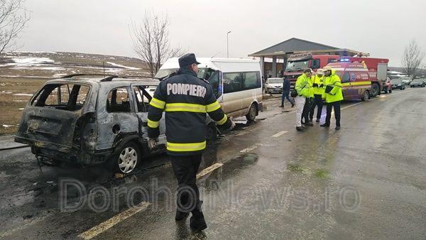 In urma impactului, autoturismul a fost cuprins de incendiu, care a fost lichidat de pompieri.