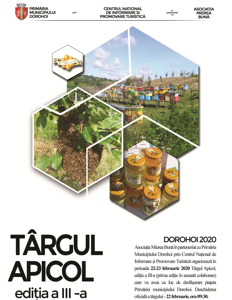 Primăria Municipiului Dorohoi prin Centrul Național de Informare și Promovare Turistică în parteneriat cu Asociația Mierea Bună și cu sprijinul Federației Asociațiilor Apicole din România ROMAPIS organizează în perioada 22 - 23 februarie 2020 Târgul Apicol, ediția a III-a (prima ediție în această colaborare) care va avea ca loc de desfășurare piațeta Primăriei Municipiului Dorohoi.