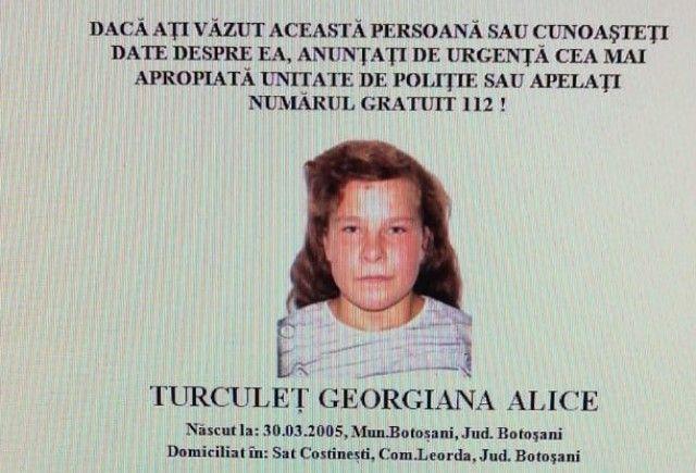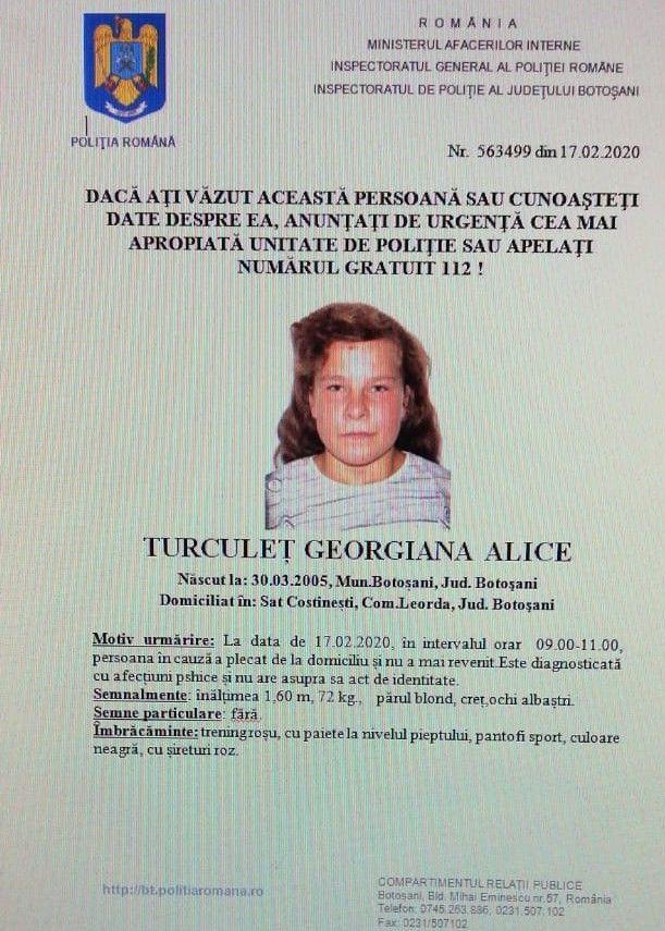 Georgiana Alice Turculeț are 15 ani și este domiciliată în comuna Leorda, județul Botoșani. Potrivit oamenilor legii, pe 17 februarie, în intervalul orar 9.00-11.00, persoana în cauză a plecat de la domiciliu și nu a mai revenit. Este diagnosticată cu afecțiuni psihice.