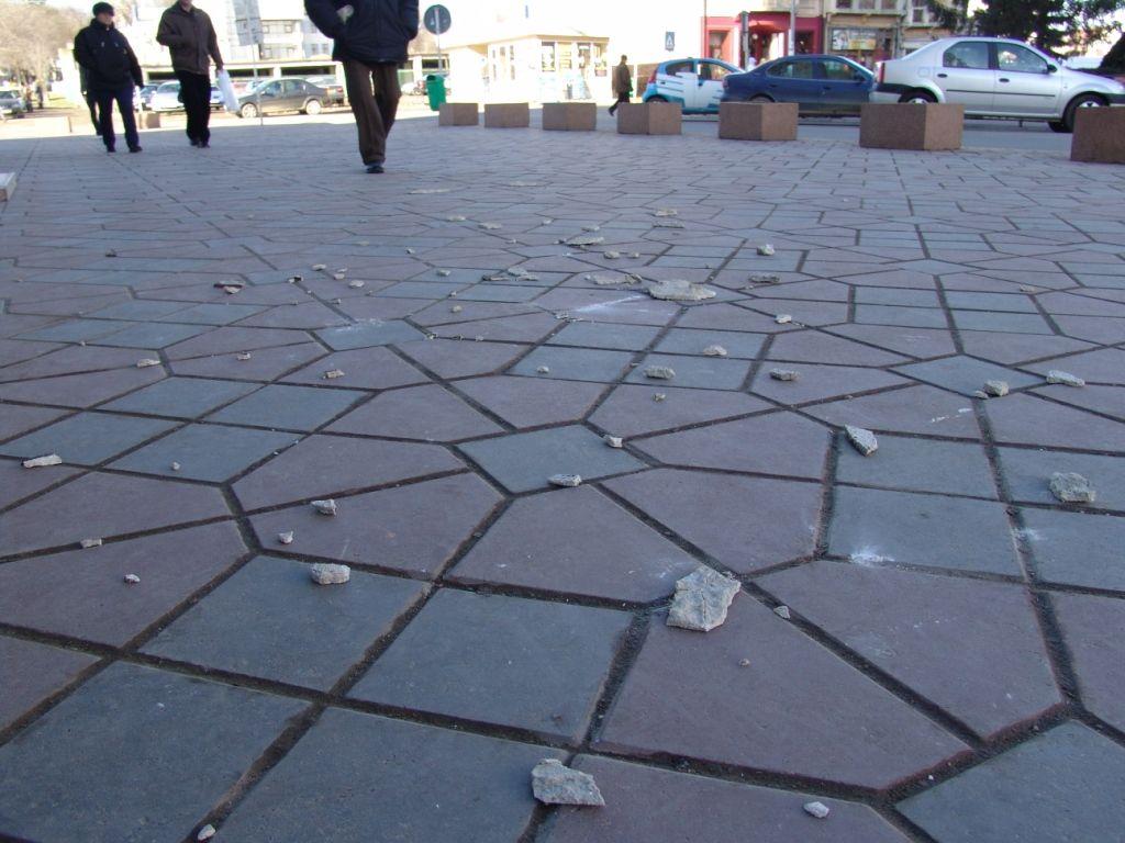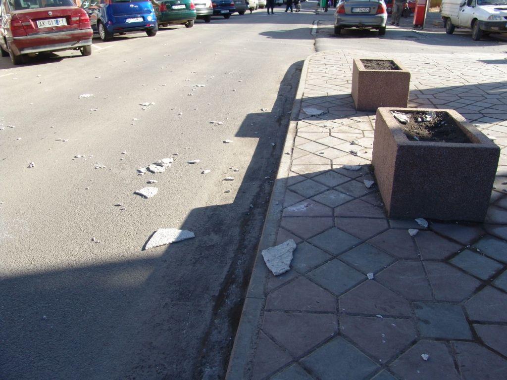 Dupa cum se poate vedea in imaginile de mai jos bucati de tencuiala au ajuns pana in strada. Angajatii primeriei au securizat zona, dar trecatorii ignorau acest avertisment expunandu-se pericolului accidentarii.