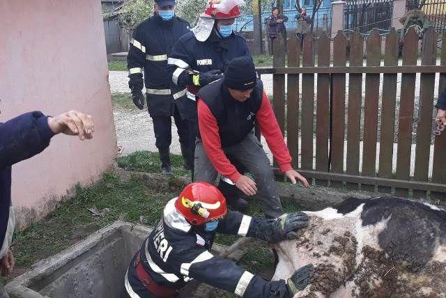 Pompierii au legat bovina, care cântărește peste 450 de kg, cu mai multe furtunuri şi au reuşit să o scoată din captivitate. Din fericire, animalul nu a fost rănit. Intervenţia a fost deosebit de grea şi a durat cca. o oră.