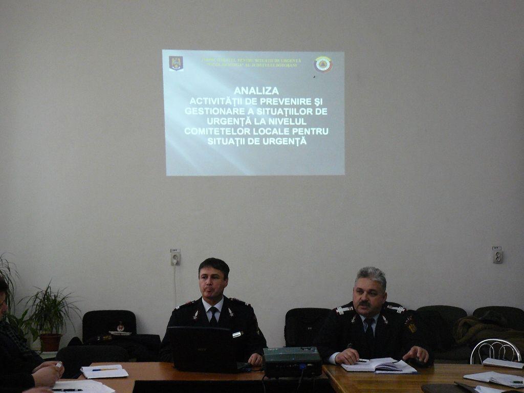 La Casa de Cultură a municipiului Dorohoi, în ziua de 18.02.2011, Inspectoratul pentru Situaţii de Urgenţă N. Iorga al judeţului Botoşani a desfăşurat instructajul anual de pregătire cu preşedinţii C.L.S.U. din localităţile: Dorohoi, Bucecea, Brăieşti, Broscăuţi, Conceşti, Cristineşti, Cîndeşti, Corlăteni, Cordăreni, Darabani, Dersca, Dimăcheni ,Hudeşti, Ibăneşti, Leorda, Lozna, Mihăileni, Mileanca, Suharău, Şendriceni, George Enescu, Hlipiceni, Vf. Cîmpului, Văculeşti şi Viişoara, instructaj care a avut ca obiectiv principal perfecţionarea deprinderilor manageriale a primarilor pentru planificarea, organizarea, conducerea, desfăşurarea şi evaluarea activităţilor de prevenire, protecţie şi intervenţie în domeniul situaţiilor de urgenţă ce se pot manifesta pe teritoriul unităţilor administrativ-teritoriale funcţie de riscurile identificate.