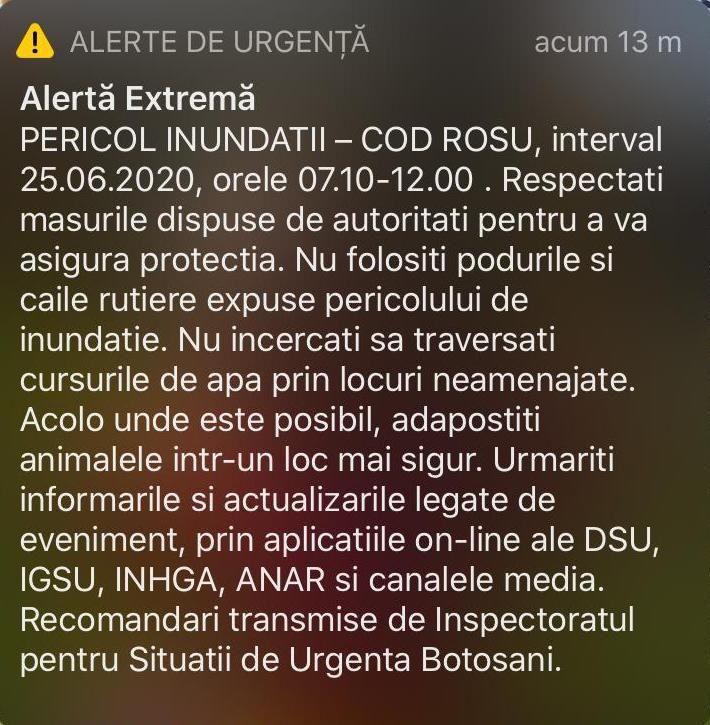 În această dimineață, a fost transmis un mesaj Ro-Alert pentru Botoșani, de COD ROȘU de inundații, valabil până la ora 12.00. Cetățenii sunt sfătuiți să respecte măsurile dispuse de autorități pentru a-și asigura protecția.