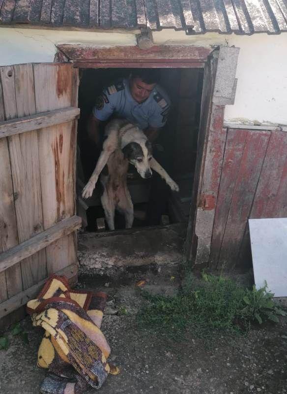 Un apel 112 i-a direcționat pe strada Ștefan cel Mare, unde o femeie în vârstă de 88 de ani îi aștepta cu sufletul la gură. Motivul temerilor acesteia era reprezentat de un dulău care nu îi aparținea și din cauza căruia bătrâna nu mai reușea să intre în beci. La rândul său, nici câinele nu putea să urce pe scara din lemn sprijinită la intrarea în beci pentru a pleca.