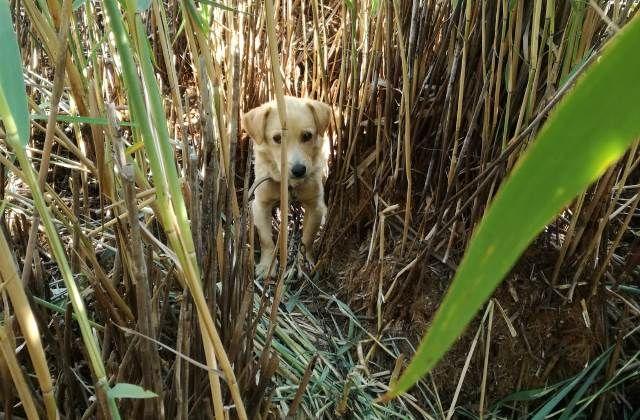 Un cățel a rămas captiv în stufărișul unui iaz de pe raza satului Ipotești, comuna Mihai Eminescu, după ce lanțul s-a agățat de vegetația deasă.