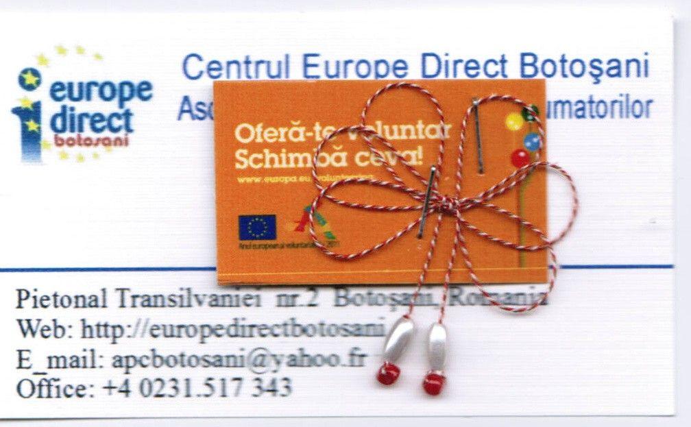 Centrul Europe Direct Botoşani a distribuit, de 1 Martie 2011, 150 de mărţişoare europene: în Piaţa Centrală, unde se află sediul Asociaţiei pentru Protecţia Consumatorilor (APC Botoşani), la Colegiile Naţionale „A.T. Laurian” şi „Mihai Eminescu”. Anul acesta mărţişoarele europene au ca tematică şi emblemă „Anul Voluntariatului”,  care se desfăşoară sub deviza „Oferă-te voluntar. Schimbă ceva!”.