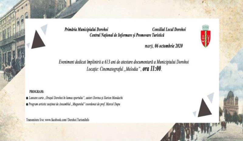 Primăria Municipiului Dorohoi și Consiliul Local Dorohoi prin Centrul Național de Informare și Promovare Turistică vor marca marți, 06 octombrie 2020, la Cinematograf „Melodia’’ evenimentul dedicat împlinirii a 613 ani de atestare documentară a Municipiului Dorohoi.