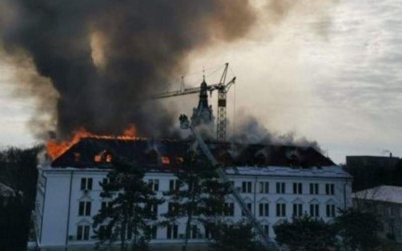 Pompierii botoșăneni intervin, alături de colegii din Suceava, sâmbătă, 06 martie 2021, pentru stingerea incendiului care a cuprins acoperișul clădirii Palatului Administrativ.
