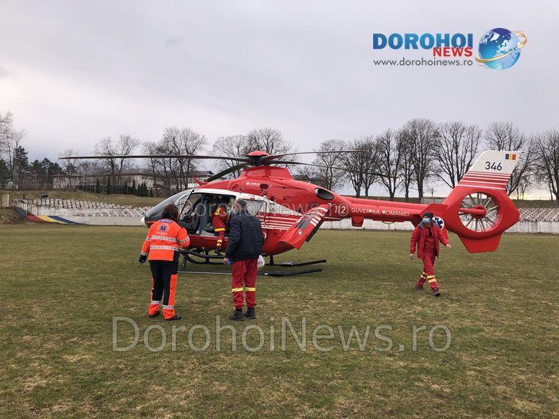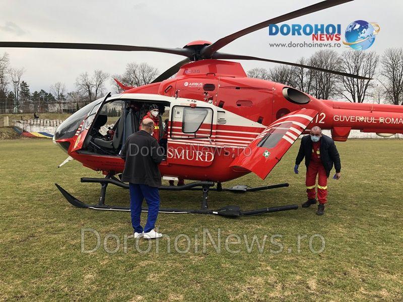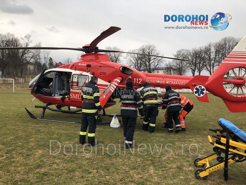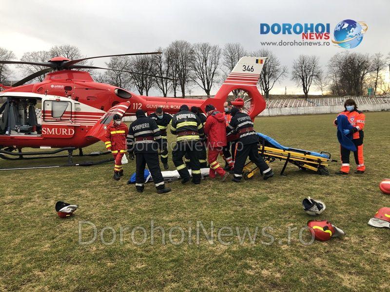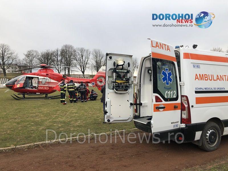 A. I., din Dorohoi, a ajuns la spital cu hemoragie subarahnoideană, posibil anevrism de arteră cerebrală rupt. Acesta a fost stabilizat și s-a solicitat elicopterul SMURD pentru transferul la Iași.