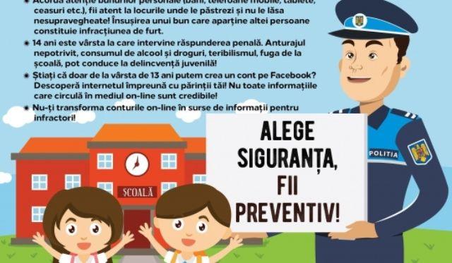 Siguranţa pe Internet a fost subiectul dezbătut de poliţişti cu elevii claselor a V-a, a VI-a și a VII-a din cadrul unităților de învățământ. Recomandările generale s-au referit la protejarea datelor personale, protejarea parolei, evitarea întâlnirilor cu persoane cunoscute pe internet sau anunţarea părinţilor despre intenţia unor astfel de întâlniri, selectarea atentă a imaginilor pe care le postează pe internet, respingerea unor contacte „agresive” venite din partea altor persoane şi anunţarea acestor incidente.