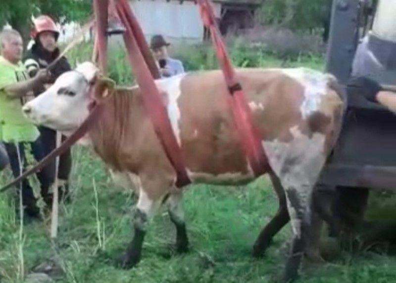 Rămasă captivă într-o fosă dezafectată de pe raza satului Guranda, comuna Durnești, o bovină a fost salvată de pompierii din Trusești.