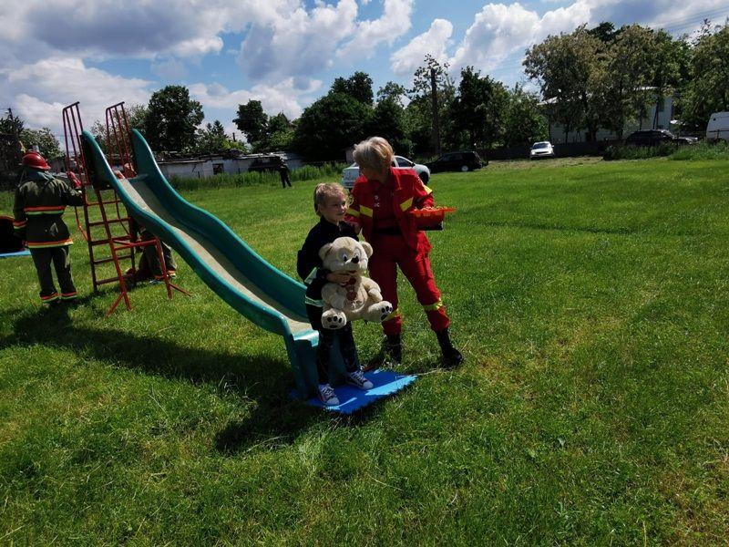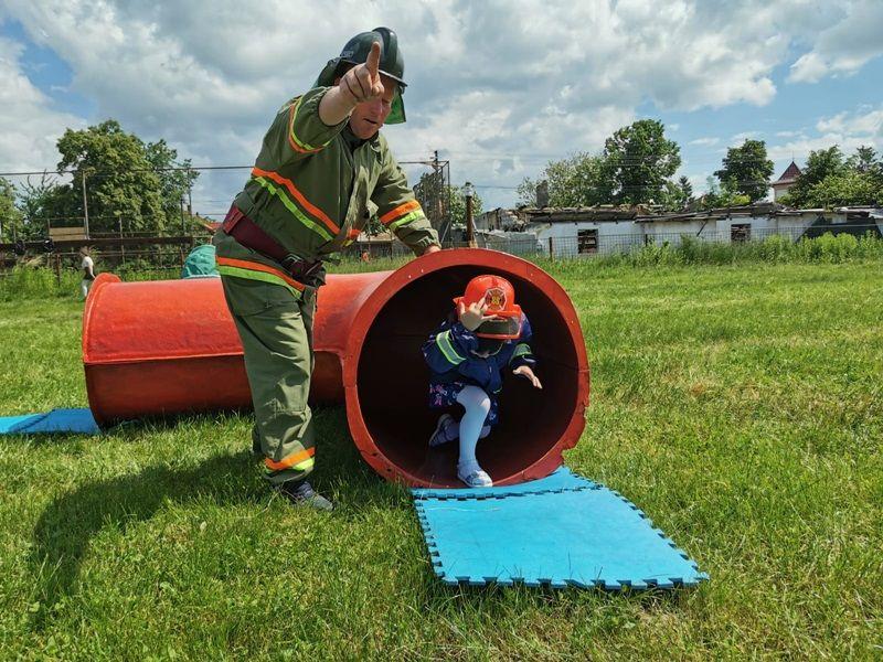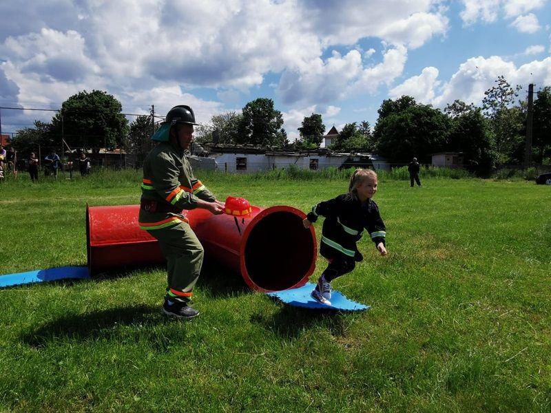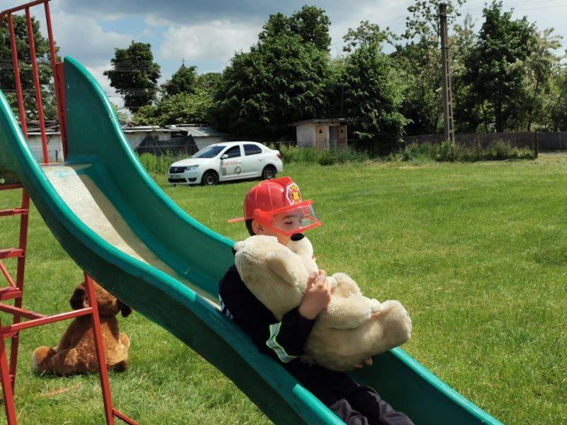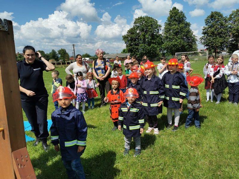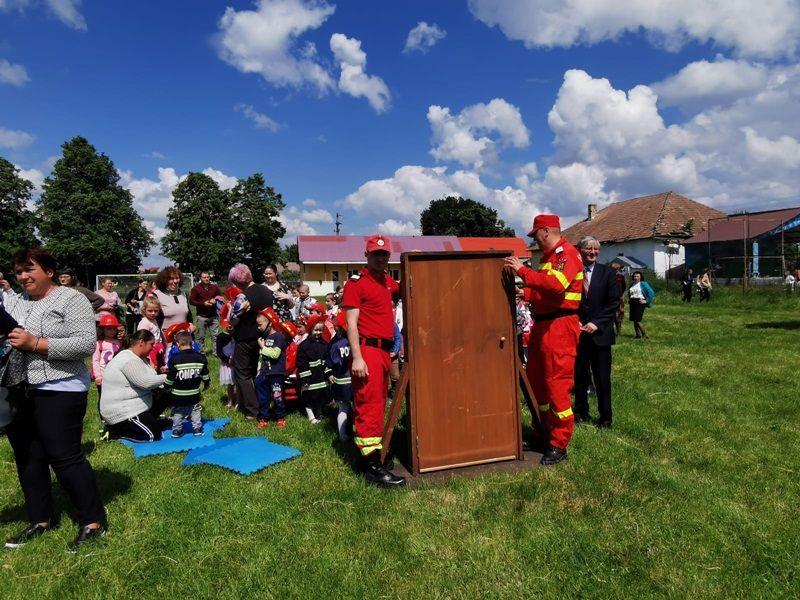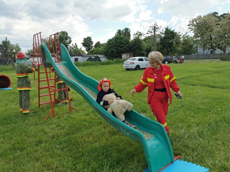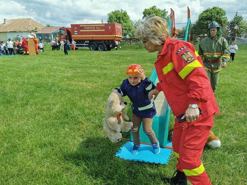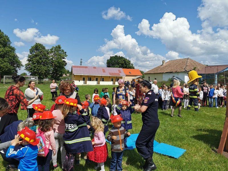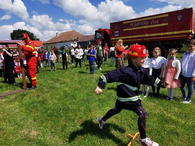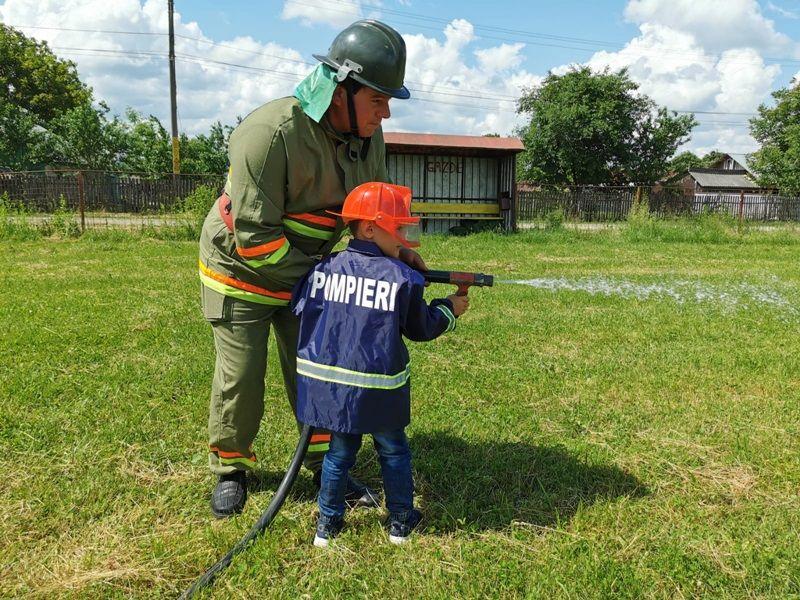 Echipați cu costume de intervenție, micii pompieri au trecut printr-un tunel, au salvat ursuleţul sau cățelul de pluș de pe tobogan, au alergat printre jaloane şi au stins un incendiu imaginar. Au fost răsplătiți cu dulciuri și multe aplauze.