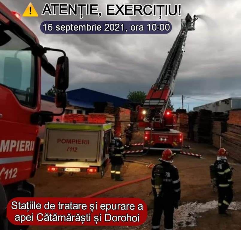 Inspectoratul pentru Situaţii de Urgenţă „Nicolae Iorga” al Judeţului Botoşani desfăşoară, joi, 16 septembrie a.c., începând cu ora 10.00, un exerciţiu de cooperare cu forțe și mijloace în teren pentru limitarea şi înlăturarea efectelor unor situaţii de urgenţă de amploare produse la stațiile de tratare și epurare a apei din Cătămărăști Deal și municipiul Dorohoi, dar şi în zonele adiacente acestora.