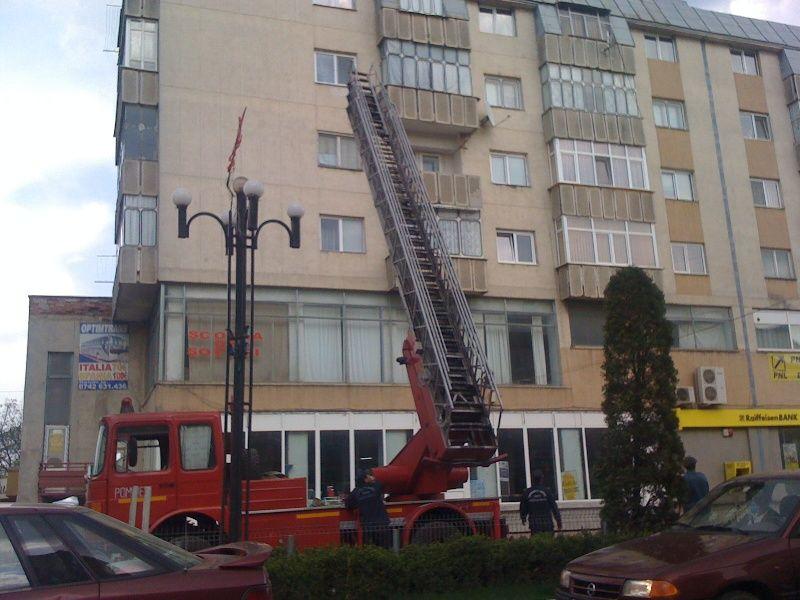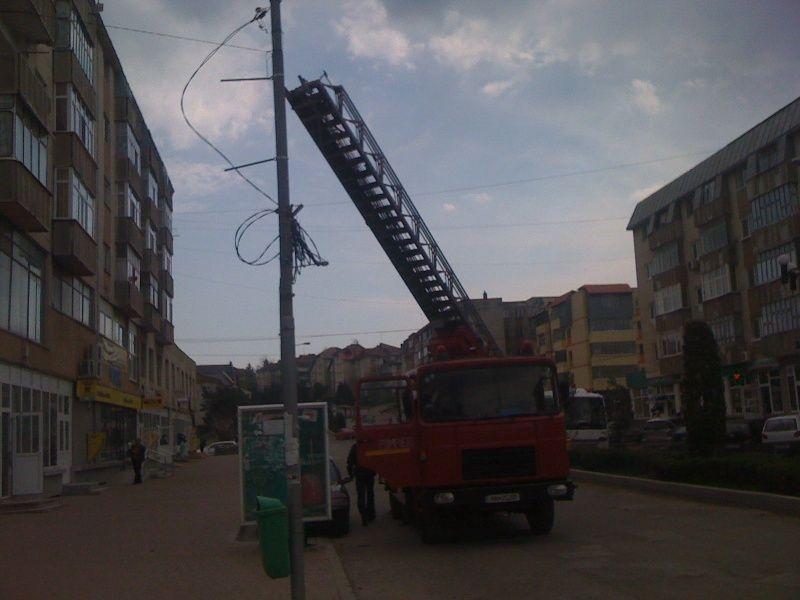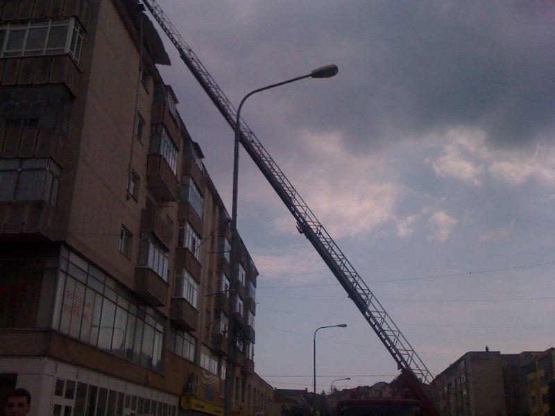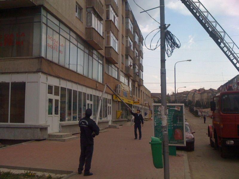 Pompierii dorohoieni au intervenit cu o autoscară, pentru a înlătura de pe bloc resturile de acoperiș care erau în pericol să cadă.