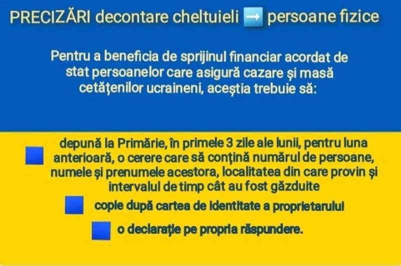 Pentru decontarea acestor cheltuieli, persoanele fizice trebuie să depună în primele trei zile lucrătoare, la începutul fiecărei luni, pentru luna precedentă, la primăriile de care aparțin, o cerere în care precizează numărul persoanelor găzduite, numele și prenumele acestora, localitățile din care aceștia declară că provin și intervalul de timp cât au stat în casa lor.
