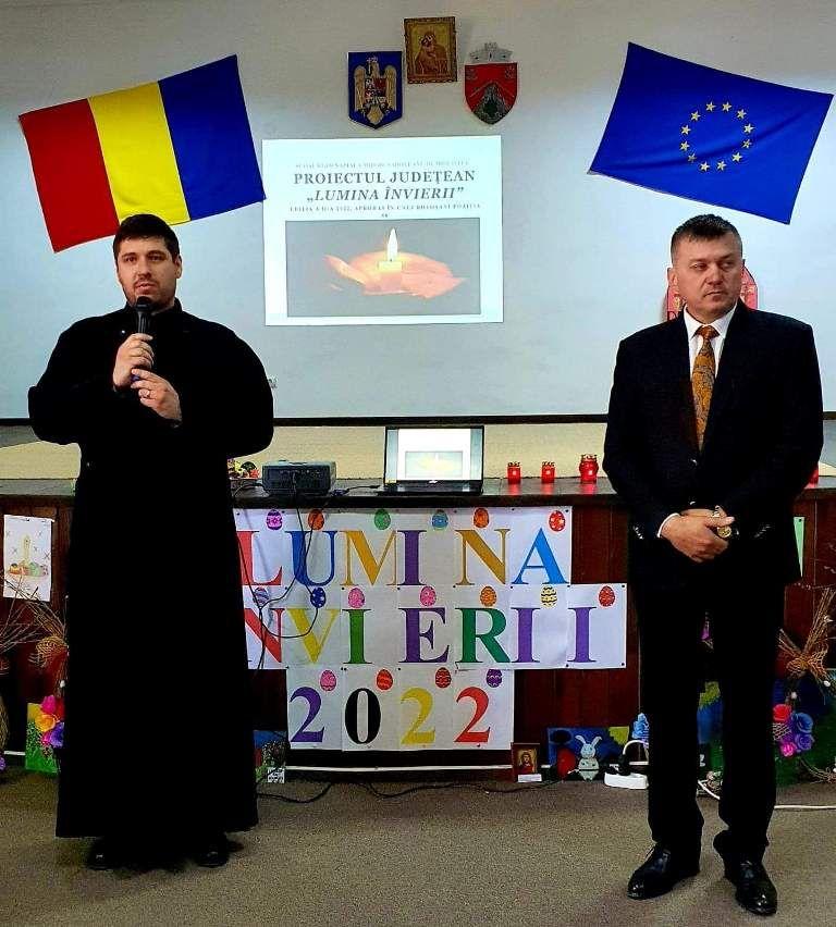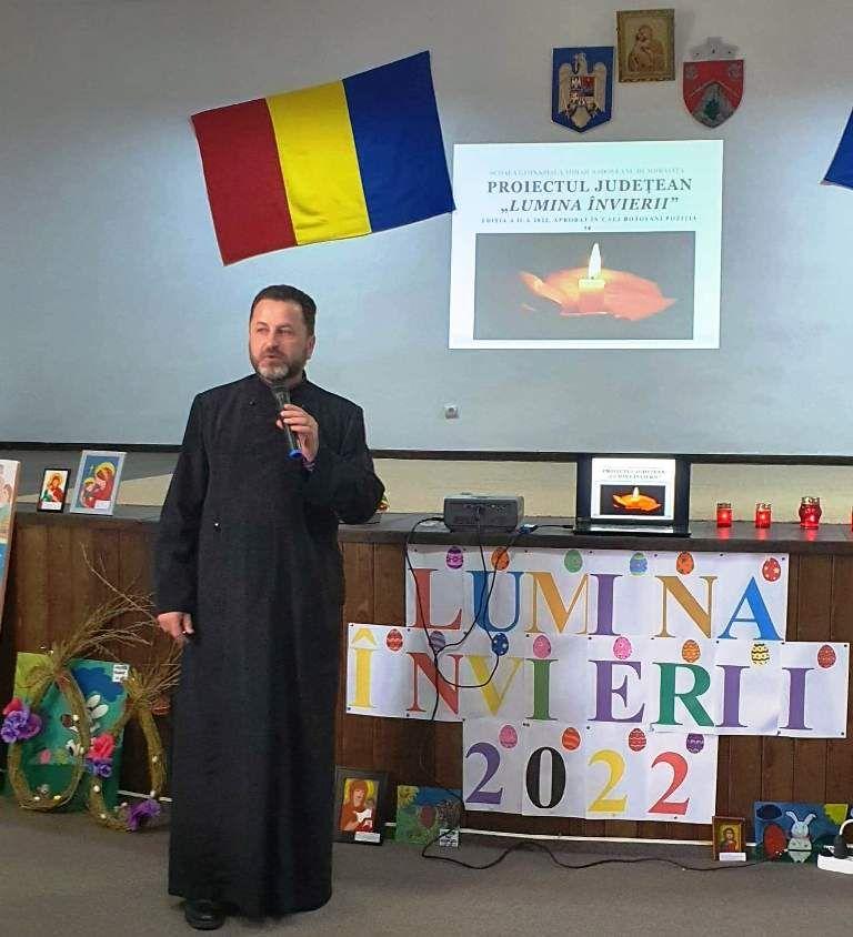 „Proiectul Lumina Învieriieste aprobat de către Inspectoratul Școlar Județean Botoșani, la poziția numărul 58. Obiectivele acestui proiect sunt: stimularea interesului cadrelor didactice și a părinților față de sărbătoarea Învierii Domnului; cunoașterea de către cadrele didactice a punctelor de vedere formulate în legătură cu valoarea spirituală a Învierii Domnului; redescoperirea de către profesori, părinți și elevi a principalelor tradiții și obiceiuri pascale; menținerea unui parteneriat familie-școală ca relație echilibrată, fructuoasă progresiv în concordanță cu particularitățile intelectuale și individuale ale educabililor. Concursul se desfășoară pe trei secțiuni: creație plastică, creație literală și pictură icoană pe sticlă. Din categoria primei secțiuni, creație plastică, am expus și astăzi câteva desene și picturi ale elevilor participanți.Dorim ca prin proiectul „Lumina Învierii” să readucem în atenția copiilor Sǎrbǎtoarea Sfintelor Paști, cea mai importantǎ și solemnǎ dintre sǎrbǎtorile anului, cea care aduce omenirii speranța mȃntuirii și a vieții veșnice, prin sacrificiul lui Iisus Hristos.” a afirmat Prof. Preot Iftode Marian, organizatorul Proiectului.