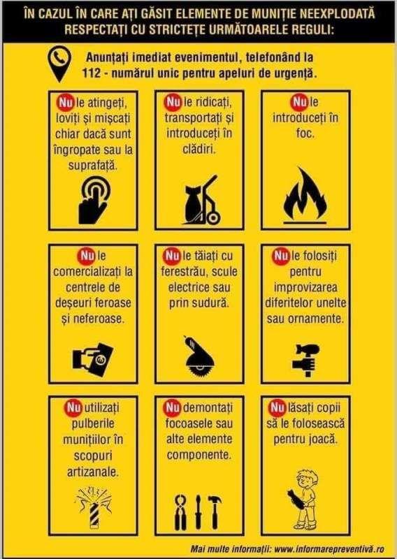 Dacă se întâmplă să găsiți obiecte metalice cilindrice sau de altă formă ce seamănă cu elemente de muniţie neexplodată trebuie să respectați următoarele reguli: