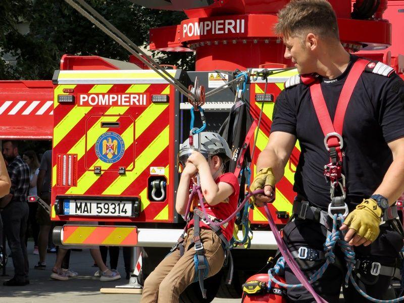 Copiii care au fost prezenți la acțiunea din parcarea Prefecturii Botoșani au avut parte de mai multe surprize. Pentru prima dată, pompierii au improvizat și o tiroliană pentru copii, folosindu-se de autoplatforma de lucru la înălțime.