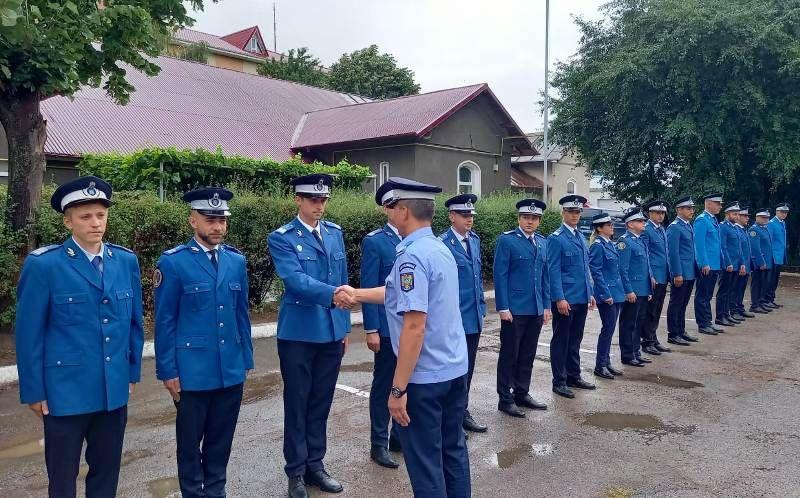 Trei ofițeri și 43 de subofițeri și-au primit în această dimineață noile trese, în cadrul unui ceremonial desfășurat la sediul inspectoratului, împreună cu felicitările conducerii și ale celorlalți colegi participanți la acest moment festiv.